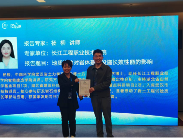 会上,杨柳老师作了题为《地质扰动对岩体基础设施长效性能的影响》的专题报告,并获颁报告证书。报告内容引发了与会同行的兴趣与交流。